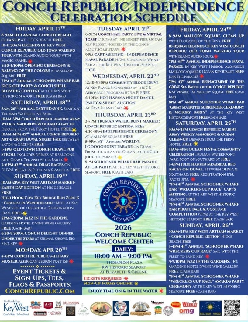 MANDATORY CAPTAINS’ MEETING FOR CR NAVAL PARADES at Schooner Wharf Bar, CRIC 2026 Party HQs, Historic Seaport, 202 William St. Show your Conch Republic Patriotism and enter your vessel in our CR Naval Parade on April 24. FREE (Cash Bar) Register your boat online at ConchRepublic.com.