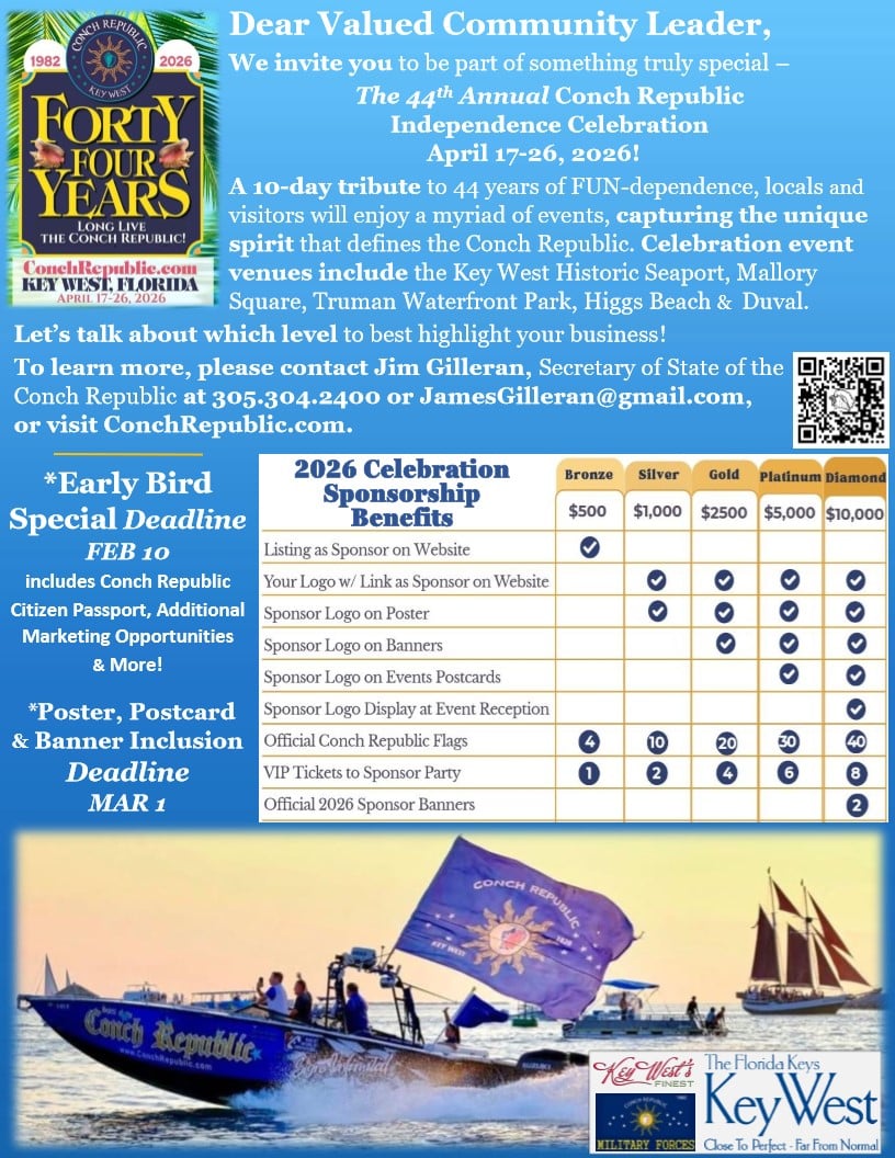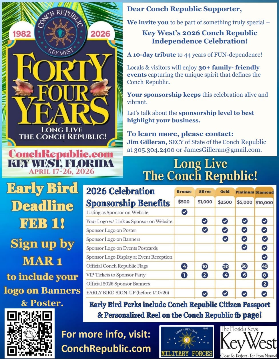Interested in sponsoring our Conch Republic Independence Celebration 2025 Festival? We welcome any and all contributions!